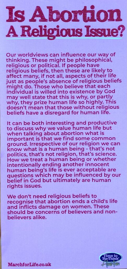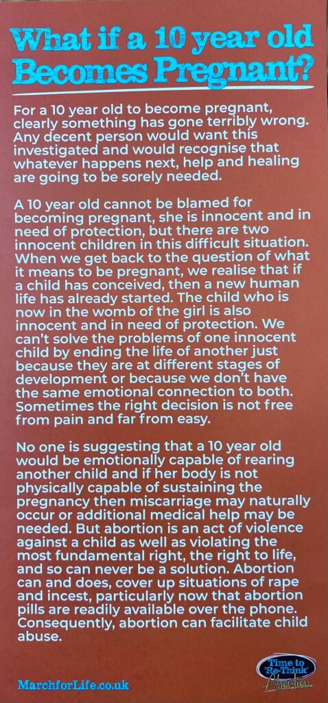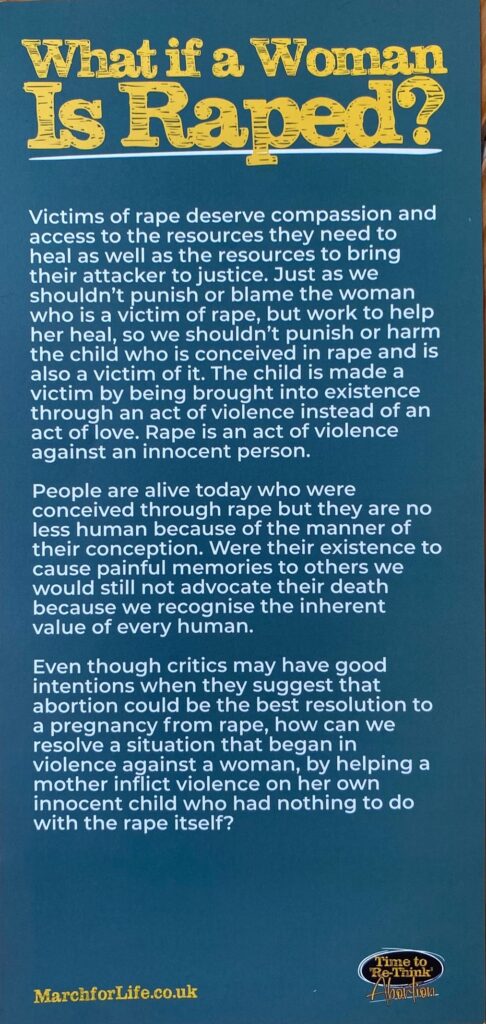 To her, that was the argument won, and she then directed me to all manner of pamphlets covering every predicted question I might face. Reading through them quickly brought home just what I was up against. The pamphlets advised, for example, what to do when faced with a common argument against ‘pro-life’, which is what happens if a child becomes pregnant? She told me that such an argument should be met with: “There are two innocent children in this difficult situation,” and “the child who is now in the womb of the girl is also innocent and in need of protection,” concluding that one should not fight violence with violence.